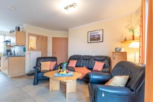 Das Ab ins Inselglück EG 2 umfasst ein Schlafzimmer, ein Wohnzimmer, eine voll ausgestattete Küchenzeile mit Kühlschrank und Kaffeemaschine sowie ein Bad mit Dusche und Haartrockner. Für zusätzlichen Komfort kann die Unterkunft Handtücher und Bettwäsche gegen Aufpreis bieten.