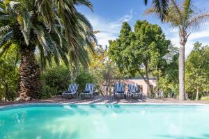 A typical English cottage with landscaped gardens houses this lodge in the Western Cape Winelands. A palm-framed oval pool is the focus of this quiet hideaway.