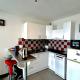 Apartmán má TV. Apartmán má také kuchyňský kout s dobrým vybavením včetně lednice, myčky nádobí a mikrovlnné trouby a koupelnu.
