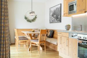 Apartment in modern Alpine style with a bedroom, a living room with a kitchenette and a balcony or a terrace.