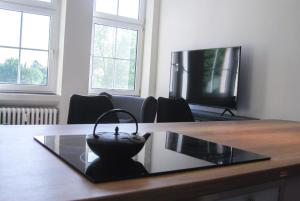 The spacious apartment at the property features 2 bedrooms, 1 bathroom, bed linen, towels, a dining area, a fully equipped kitchen, a flat-screen TV with streaming services, and a terrace with garden views. A patio used for outdoor dining is available at the property. Alte Schule Gästehaus - The principal's rooms Appartment offers views of the inner courtyard.