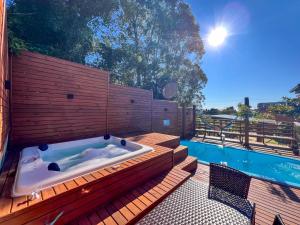 Guests will have a special experience as this holiday home features a private pool, a hot tub and a fireplace. Featuring a private entrance, this air-conditioned holiday home is comprised of 1 living room, 4 separate bedrooms and 2 bathrooms with a bath and a shower. Guests will find a stovetop, a refrigerator, kitchenware and an oven in the fully equipped kitchen. The holiday home also has a barbecue. The spacious holiday home offers a flat-screen TV with streaming services, a tea and coffee maker, a seating area, a dining area as well as garden views. The unit offers 8 beds.