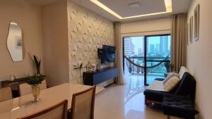 The spacious apartment with a balcony and city views has 3 bedrooms, a living room, a flat-screen TV, an equipped kitchen with an oven and a microwave, and 2 bathrooms with a shower. Towels and bed linen are offered at the property. Additional amenities at Ap 3Q, elegante e funcional, com estacionamento include chocolates or cookies.