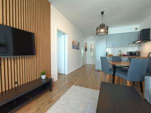 Apartament w obiekcie posiada balkon, sypialnię, salon z telewizorem, aneks kuchenny z lodówką i zmywarką oraz łazienkę z prysznicem. Z okien obiektu roztacza się widok na miasto. Ręczniki i pościel są dostępne w apartamencie Apartament Baltic Sauna Break e-apart.