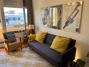 This apartment features wood floors and an equipped kitchen.