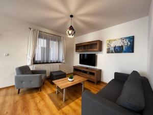 Tento klimatizovaný apartmán Apartment in the city center with free parking má 2 ložnice, plně vybavenou kuchyň s myčkou nádobí a troubou a 2 koupelny. Koupelna v ubytování ubytování je zařízena vanou, sprchou a bidetem.
