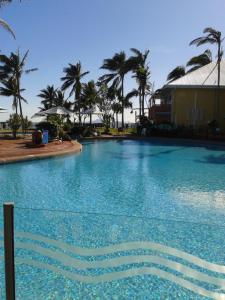 The refurbished, air conditioned apartment has a flat-screen TV, microwave, kettle, toaster, fridge/freezer, dining table and chairs. The balcony overlooks the pool and restaurant.