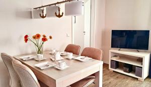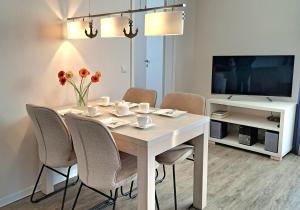 Apartmán ubytování zahrnuje 2 ložnice, plně vybavený kuchyňský kout s lednicí a myčkou a 1 koupelnu se sprchou. Koupelna v ubytování ubytování je zařízena vanou a fénem. V ubytování Apartment 17 Hafenflair, Blickrichtung InnenstadtBinnenhafen jsou pro hosty připraveny ručníky a ložní prádlo.