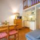 Diese Ferienwohnung ist versehen mit 2 separaten Schlafzimmern und beinhaltet eine Küchenzeile mit einem Kühlschrank, einem Ofen und einem Essbereich.