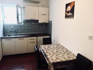 This apartment with a balcony has a stovetop, dining area and electric kettle.