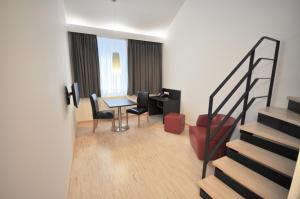 This apartment features a fully equipped kitchenette, a seating area and a ecological wood pellet heating system. The bedroom is on the second floor and has a private balcony.