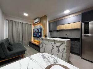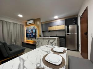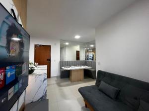 Questo appartamento con balcone e vista sulla città offre 2 camere da letto, un soggiorno, una TV a schermo piatto, una cucina con frigorifero e forno e 1 bagno con doccia. Asciugamani e lenzuola sono inclusi nei servizi di Apê Completo com Cozinha e Sala Confortável.