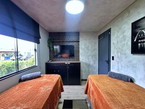 L'appartamento di Apê térreo sem escada com Ar Cond, WiFi e banheira! comprende 2 camere da letto, area salotto, TV a schermo piatto, bagno con doccia e cucina con frigo e lavastoviglie. Apê térreo sem escada com Ar Cond, WiFi e banheira! fornisce lenzuola e asciugamani ai propri ospiti.