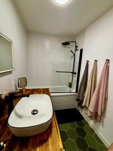 Klimatizovaný apartmán Appart Standing, Jardin, Terrasse, Parking zahrnuje 1 ložnici, obývací pokoj, plně vybavenou kuchyň s lednicí a myčkou a 1 koupelnu. V koupelně ubytování ubytování nechybí vana a toaletní potřeby zdarma.