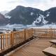 Apartment with a terrace featuring mountain views, a flat-screen satellite TV, a kitchenette with a dining area, and a bathroom with a shower. Amenities like a safety deposit box are provided.
