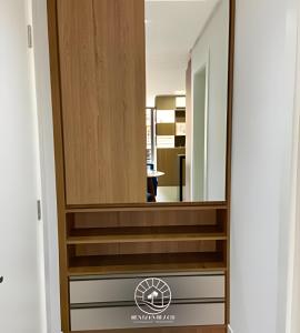 L'appartamento di Apto Studio para 03 pessoas em Torres - Ar condicionado - Smart TV - Wifi - Vaga de garagem - Lavanderia - Aceita Pet - 400mts da Praia dispone di 1 camera da letto, cucina con frigo e microonde, TV a schermo piatto, area salotto e bagno con doccia.