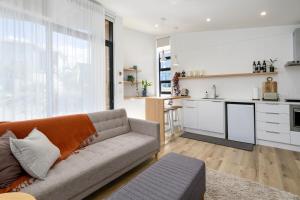 L'appartamento con 1 camera da letto presso Architectural guest house in St Clair presenta soggiorno con TV a schermo piatto, cucina e bagno.