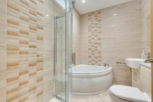 Apartmán má TV. Apartmán má také kuchyň s kompletním vybavením včetně myčky nádobí a trouby a koupelnu.