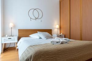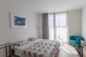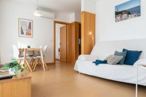 Dieses moderne Apartment mit 1 Schlafzimmer mit Doppelbett verfügt über Klimaanlage und ein Wohnzimmer mit einem Sofa.