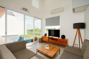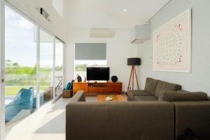 This holiday home's standout feature is the pool with a view. Boasting a private entrance, this air-conditioned holiday home includes 1 living room, 2 separate bedrooms and 2 bathrooms with a walk-in shower and a hairdryer. A kitchen fitted with a stovetop, a refrigerator and kitchenware is available for cooking and storing food. The spacious holiday home offers a tea and coffee maker, a seating area, a dining area, a flat-screen TV with cable channels, as well as sea views. The unit has 3 beds.