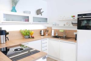Tento apartmán má 2 ložnice, obývací prostor, kuchyňský kout s kompletním vybavením včetně lednice a myčky nádobí a 2 koupelny. V koupelně ubytování ubytování nechybí sprcha ani fén.