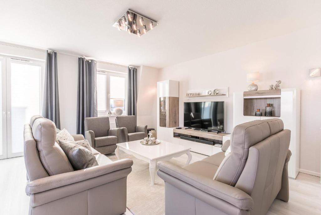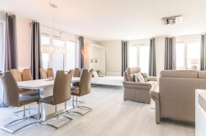 Bahnhofstr 9 MeerGenuss, Penthouse-WHG offers a spacious unit with 2 bedrooms, a TV, kitchen with dishwasher and oven, washing machine, and bathroom with shower. Guests at the property can enjoy the surroundings from the outdoor dining area. Bahnhofstr 9 MeerGenuss, Penthouse-WHG is allergy-free and non-smoking.