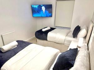 This holiday home comprises 3 bedrooms, a kitchen and 2 bathrooms with a walk-in shower. Meals can be prepared in the kitchen, which comes with a stovetop, a refrigerator, an oven and a microwave. The holiday home provides a flat-screen TV, a washing machine, a dining area, an electric kettle as well as garden views. The unit offers 4 beds.