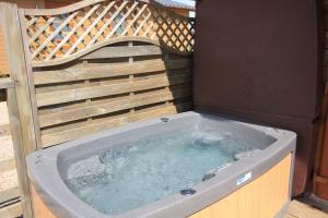 "4* Waterside gold hot tub lodge – 3 bedrooms sleeping up to 6. The modern open plan living area has a vaulted ceiling and oak flooring. The living area has a leather suite , a 55″ smart tv and a 6 seater oak dining table. The fully equipped kitchen includes a centre island with integrated breakfast bar.The large patio doors lead out onto private decking with your own hot tub where you can relax and watch the abundance of wildlife on our very own pond.The master bedroom has a double bed and en suite shower room. There is a second double bedroom and a small twin sharing a family bathroom. A maximum of 2 well behaved dogs are welcome (charge of £10 per dog per stay)