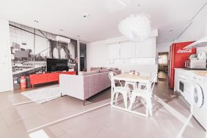 This bright, spacious apartment has a double bedroom with an en suite bathroom, and a twin bedroom. It also features a kitchen, a dining table, a seating area with a sofa and flat-screen TV, and a washing machine.