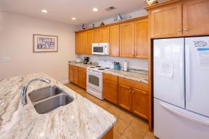 Tento prázdninový dům má 4 ložnice a kuchyň s kompletním vybavením včetně lednice, myčky nádobí a jídelní části.