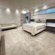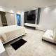 Cet appartement avec climatisation comporte 1 chambre, un coin repas, une télévision à écran plat et une cuisine avec un réfrigérateur.