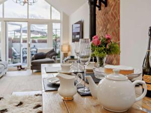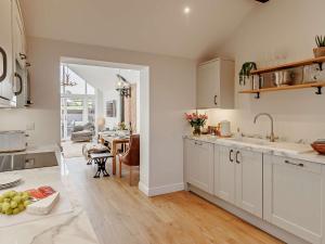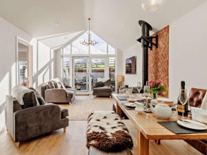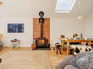 The fireplace is a top feature of this holiday home. The holiday home has 2 bedrooms, 2 bathrooms and a kitchen. The kitchen features a refrigerator, a dishwasher and kitchenware. The holiday home features a washing machine, a high chair for children and garden views. The unit has 3 beds.