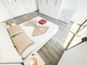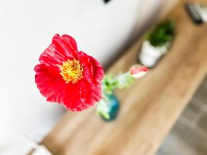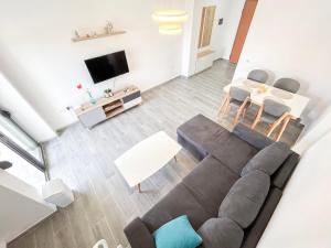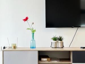 Diese Ferienwohnung mit Klimaanlage ist versehen mit 1 Schlafzimmer, TV und einer Küche mit einem Kühlschrank und einem Ofen In dieser Ferienwohnung werden Handtücher und Bettwäsche angeboten.