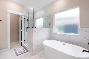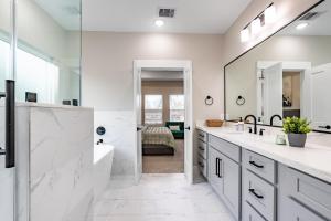 Boasting a private entrance, this air-conditioned holiday home features 1 living room, 3 separate bedrooms and 3 bathrooms with a bath and a shower. Guests can make meals in the kitchen that has a refrigerator, a dishwasher, kitchenware and a microwave. The holiday home has carpeted floors, a seating area with a flat-screen TV, a washing machine, a tea and coffee maker as well as garden views. V této ubytovací jednotce se nachází 6 postelí.
