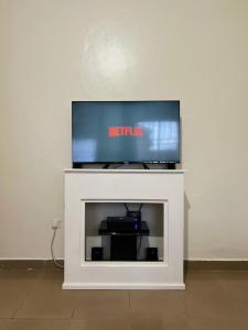 1 Bedroom Apartment in Kiwatule consists of 1 bedroom, a fully equipped kitchen, and 1 bathroom. A flat-screen TV is featured.
