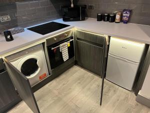 Diese Ferienwohnung mit kostenlosem WLAN und 1 Schlafzimmer bietet Flachbild-TV, eine Waschmaschine und eine Küche mit einem Ofen und einer Mikrowelle.