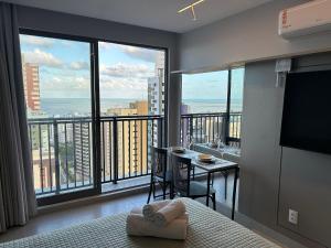 At Bela Hospedagem - #1701 Simple Manaira, linda vista da cidade e do mar, the air-conditioned unit includes 1 separate bedroom, a kitchen with microwave and fridge, and 1 bathroom. Towels and bed linen are available at Bela Hospedagem - #1701 Simple Manaira, linda vista da cidade e do mar. The property offers city views.