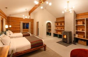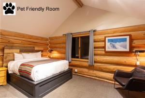 This spacious newly renovated room features vaulted ceilings with cozy log walls. It includes a work station, 2 queen beds, walk in shower, coffee area, heated floors and a balcony with beautiful views of the property. Please note, no rooms have a TV or kitchen equipment.