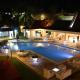 La zona de la piscina, rodeada de jardines, cuenta con tumbonas, mesas y sombrillas. El hotel también alberga un bar.