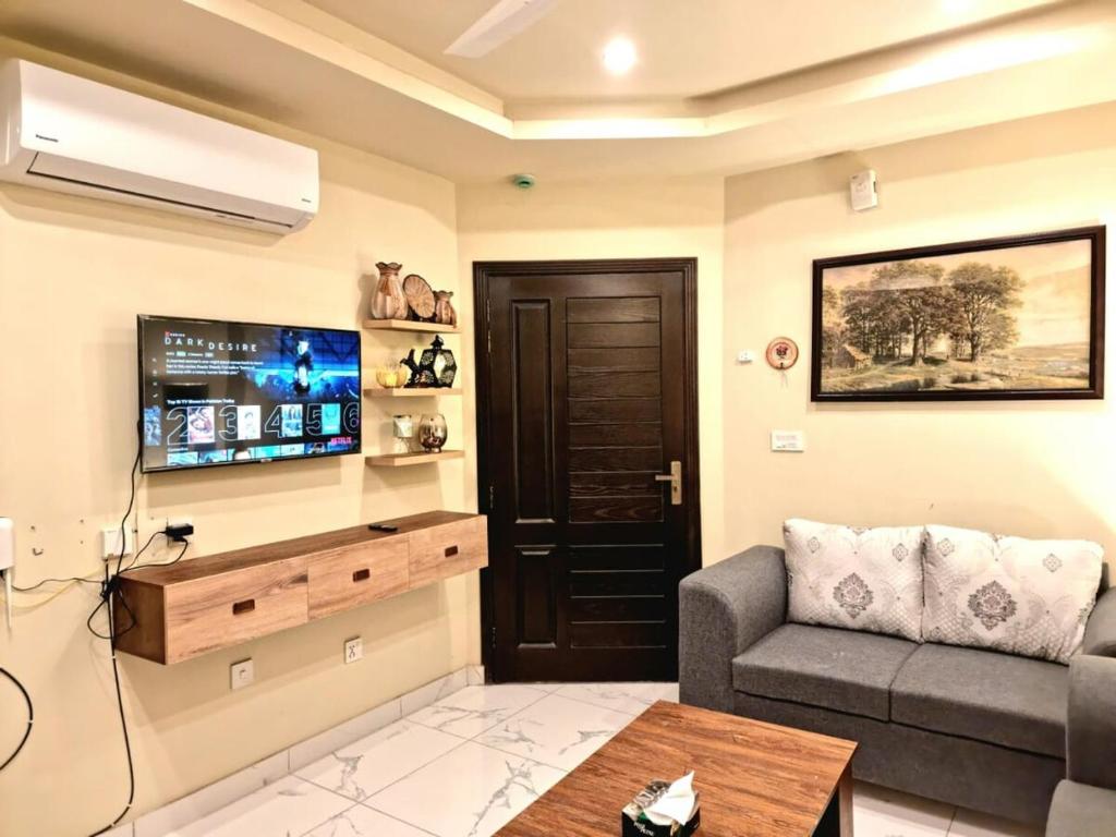 L'appartamento di 1 BHK in Bahria town dispone di 1 camera da letto, cucina e TV a schermo piatto.