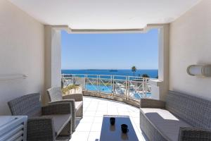 At Blue view - Terrace with sea view, pool, air conditioning, the apartment is equipped with 1 bedroom, 1 bathroom, bed linen, towels, a flat-screen TV with streaming services, a dining area, a fully equipped kitchen, and a terrace with sea views. Guests at Blue view - Terrace with sea view, pool, air conditioning can enjoy a meal in the outdoor dining area with pool views. Blue view - Terrace with sea view, pool, air conditioning is non-smoking and soundproof.