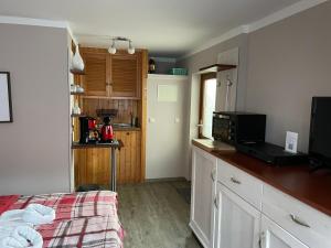 L'angolo cottura dispone di frigorifero, forno e tostapane, più macchina da caffè e bollitore elettrico.