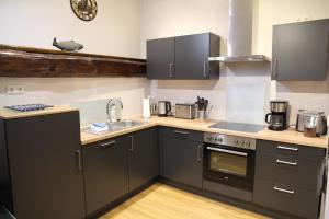 Das Burghaus 4 umfasst ein Schlafzimmer, eine Küche mit Kühlschrank und Geschirrspüler sowie ein Bad mit Dusche, Haartrockner und Waschmaschine.