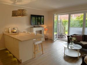 The spacious apartment at the property comprises 2 bedrooms, a TV, a bathroom with a shower, and a fully equipped kitchen with a dishwasher and oven. Guests at Büsumer Deich can enjoy a meal in the outdoor dining area with garden views.