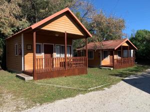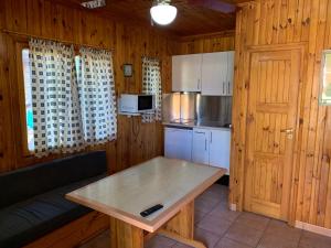This wooden bungalow features a double bedroom, a twin bedroom and a lounge area with a sofa bed, table, chairs and TV. There is also a kitchenette with a hob and a fridge. The bathroom has a shower. The bungalow comes with a small private porch with a table and benches, and there is a free parking space next to the bungalow. Towels are not provided.