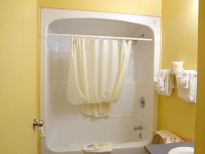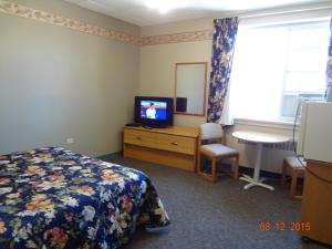 A work desk and a TV is featured in this room. An en suite bathroom with a tub/shower combination is provided.