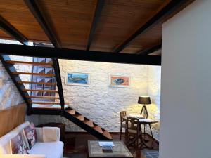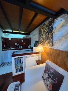 This bungalow has a king size bed, a living room with a double sofa bed and a fully equipped kitchenette with a refrigerator, a stovetop, a microwave, a toaster and a coffee machine. There is also an outdoor seating area with a table, chairs and a parasol.