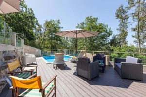 All rooms feature a wooden décor, air conditioning and heating. The fully equipped kitchen includes a washing machine, and the living room offers access to the terrace and pool.