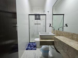 Tato vila s klimatizací má 3 ložnice, obývací prostor, kuchyň s kompletním vybavením včetně lednice a mikrovlnné trouby a 3 koupelny. V koupelně ubytování Casa espaçosa, mesa de sinuca e piscina aquecida! nechybí sprcha ani fén.