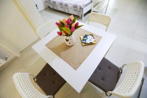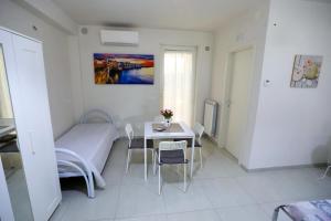 This large room offers a private bathroom, a dining table, and a covered furnished terrace.